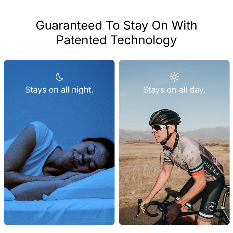 Our Tabs are made of 100% medical grade, latex-free, hypoallergenic 3M materials. We combine three layers of proprietary materials to achieve a sweat-wicking, incredibly sticky, stay-all-day, and night effect. Inside of each Tab is a small steel disc that the magnets inside the Band attract to.